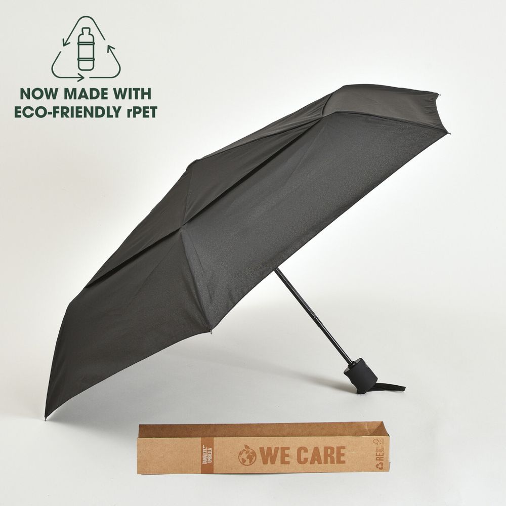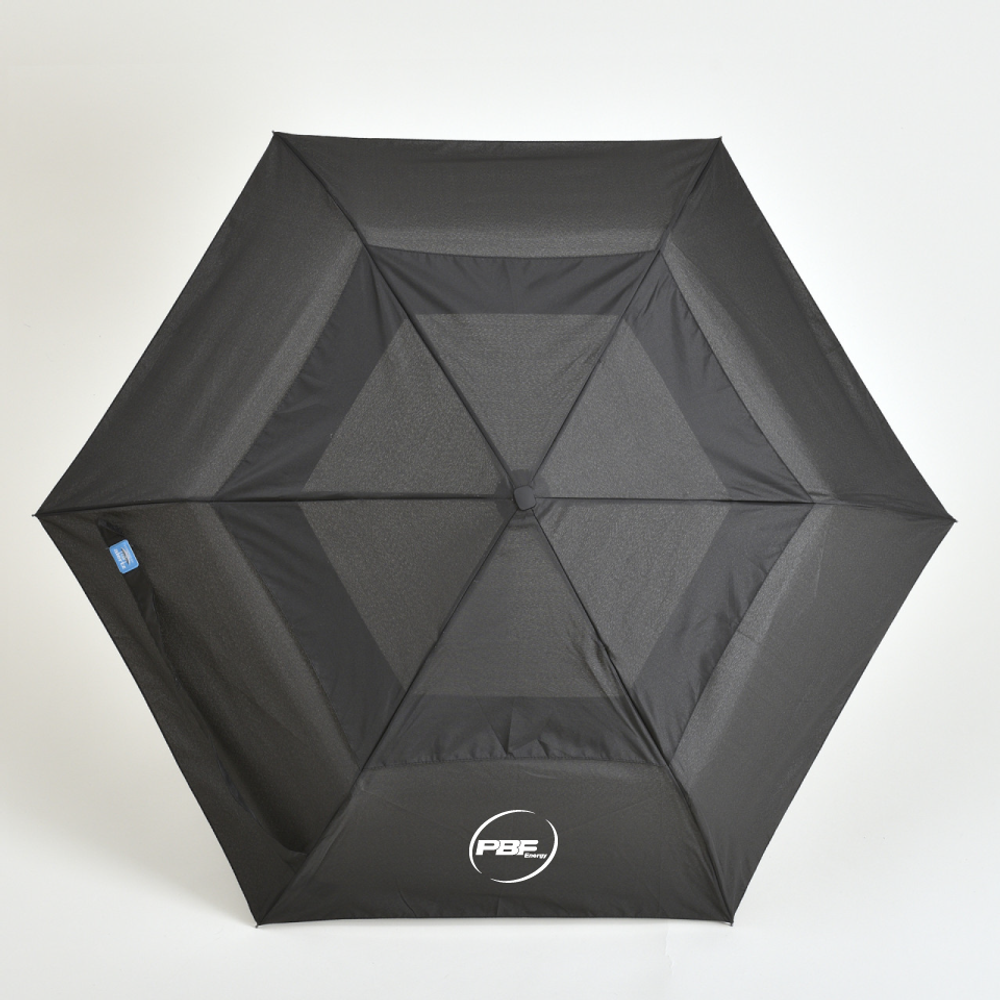 sku: PBF5007sOur Super Flat Mini is now made with eco-friendly rPET polyester. Built with lightweight aluminum and fiberglass construction, along with a vented canopy, the Super Flat Mini is convenient to carry but still strong enough to fight off tough conditions. The auto open and close umbrella’s 43” arc folds to a suitable 10” when closed, and features a hard rubber handle and wrist strap.